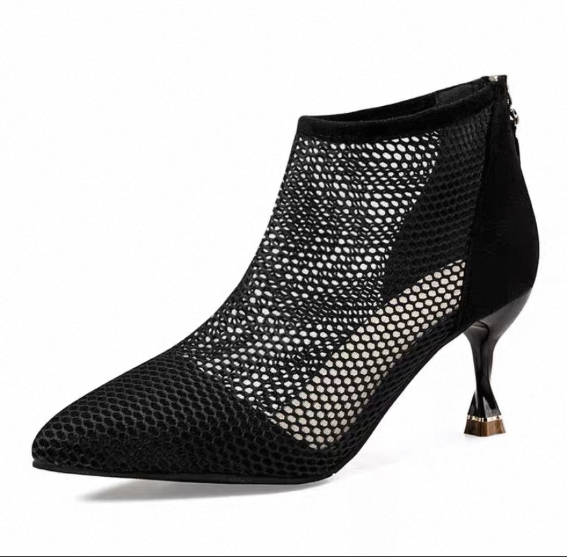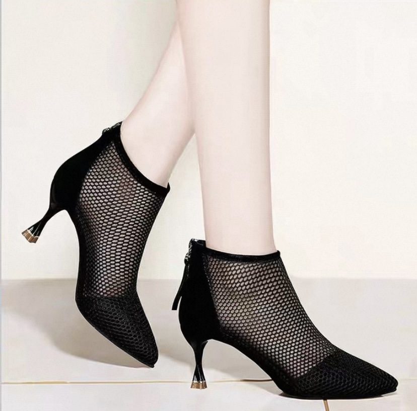 透氣網紗,正常版型1. 鏤空網紗尖頭短靴也太仙了!黑/杏兩色超百搭,細跟顯腿長還透氣,春夏穿剛剛好🥾 2. 網紗鏤空高跟短靴來了!尖頭設計拉長腿線,透氣網面不悶腳,日常搭褲裝裙裝都超有范~