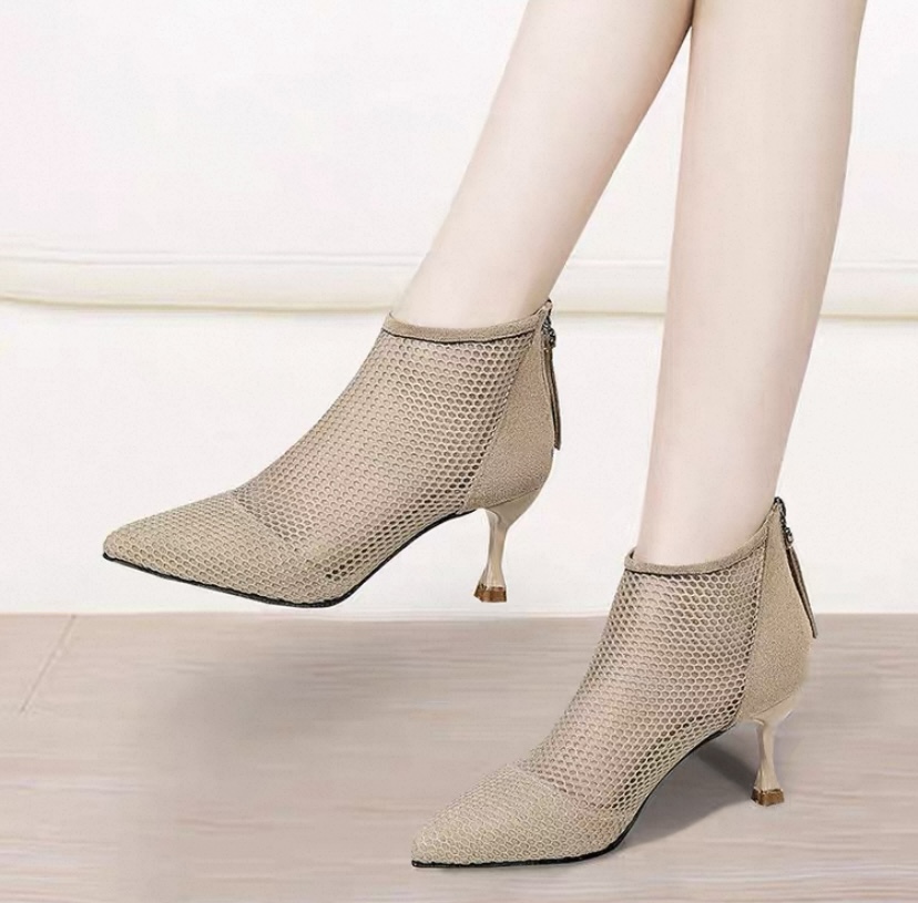 細跟網狀踝靴1. 鏤空網紗尖頭短靴也太仙了!黑/杏兩色超百搭,細跟顯腿長還透氣,春夏穿剛剛好🥾 2. 網紗鏤空高跟短靴來了!尖頭設計拉長腿線,透氣網面不悶腳,日常搭褲裝裙裝都超有范~